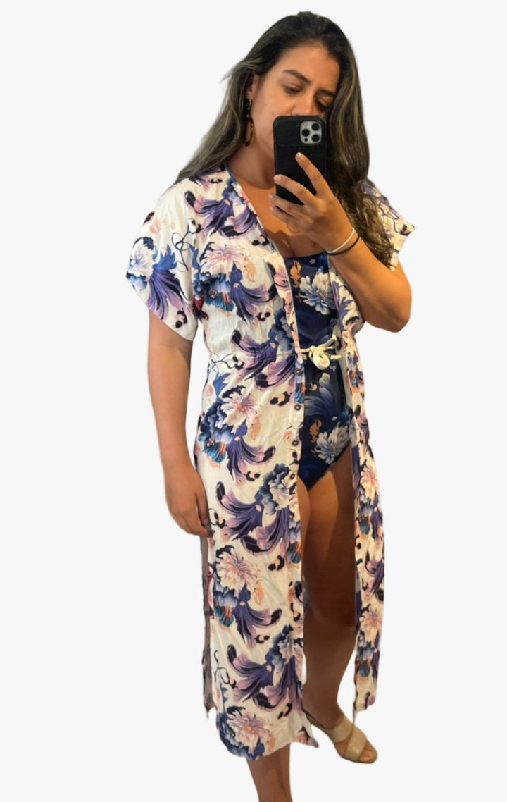 Resalta tu look playero con nuestra salida de baño tipo kimono con estampado floral. Diseñada para mujeres que aman verse elegantes y frescas bajo el sol, esta prenda ligera y fluida se adapta perfectamente sobre cualquier traje de baño. Su silueta larga y abierta estiliza la figura, brindándote comodidad y libertad de movimiento. Ideal para la playa, la piscina o un paseo en un resort.