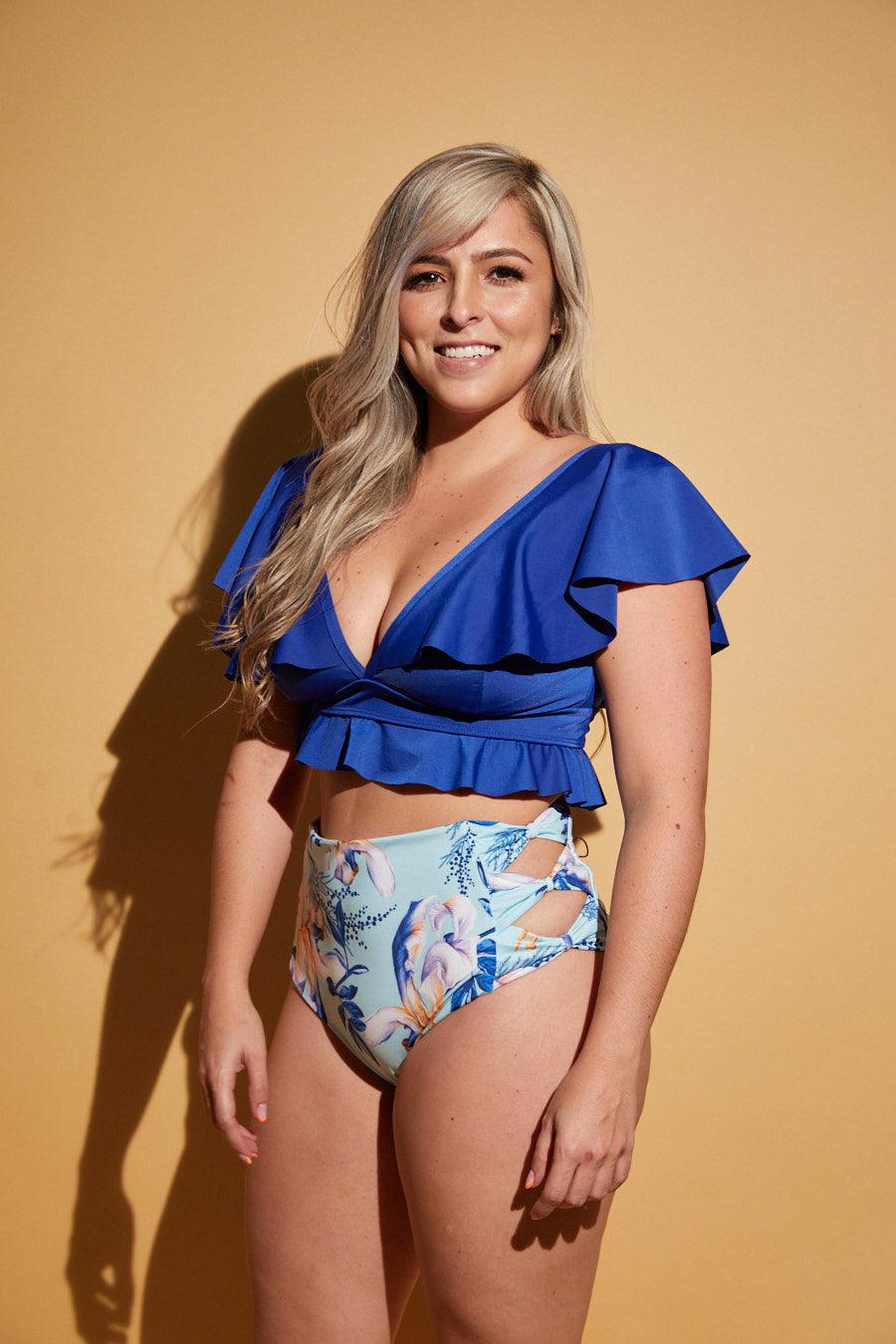 Vestido de baño dos piezas con copa prehormadas removibles, top con boleros ideal para busto pesado porque tiene soporte, tanga alta con detalles laterales.